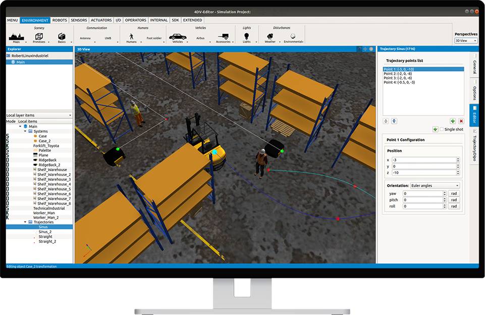 4DV-EDITOR gives access to a user-friendly interface developed to facilitate the creation of scenarios and the interfacing between systems, real or virtual. It also gives access to optional modules: GIS and MobilityStandard.