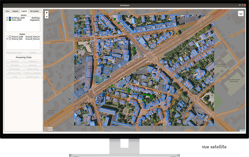Le module G.I.S est un module de création d’environnements de simulation 3D à partir de Systèmes d’Informations Géographiques comme IGN, Here, ESRI, OpenStreetMap, etc..